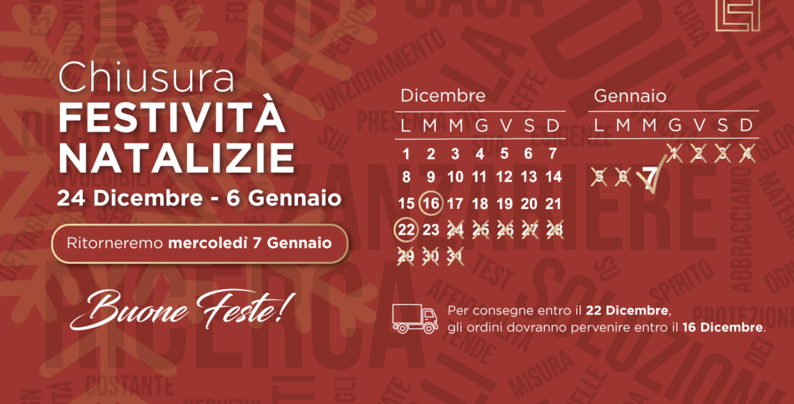 Per garantire una corretta organizzazione logistica, segnaliamo inoltre che, per assicurare le consegne entro il 22 dicembre, gli ordini dovranno pervenire entro il 16 dicembre.